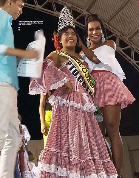En lo que respecta a las imágenes del Sirenato Gay de la Cumbia de Puerto Colombia, las imágenes sobre este evento se encuentran realizadas por el artista Juan Carlos Dávila (figura 5) y del archivo del creador y director del evento, Thael de la Rans (Brando Sanjuán García) (figura 6). En las tomadas por Dávila, se aprecian momentos de la edición 2015 del Sirenato Gay, en las que las candidatas transformistas deben demostrar su conocimiento del baile de la cumbia, interpretarlo y llevar el atuendo correspondiente; pero saltando el protocolo del momento se aprecia una imagen que Dávila capta: dos chicas travestis cuya única evidencia son los tacones que llevan puestos, debido a que el evento convoca a comitiva y seguidores que apoyan a las candidatas. En la del archivo de Thael de la Rans, se le observa coronando a Lianis de la Rans, candidata de Puerto Colombia, la anfitriona, que ganó en la edición de 2017, y que pertenece a la Casa de la Rans, razón por la cual lleva el apellido del creador y director del evento. Aquí dejo lugar a la voz de Thael de la Rans: