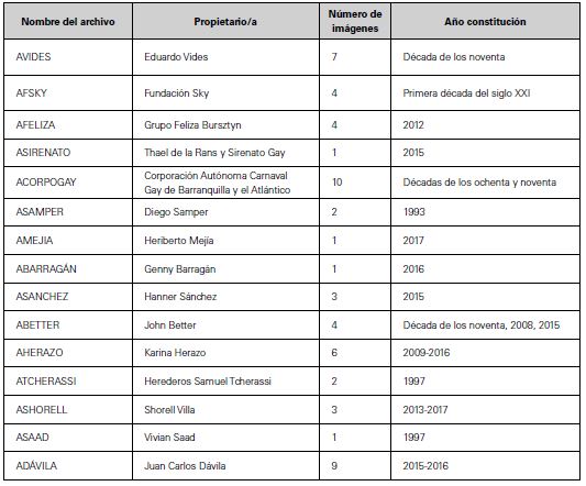 Barranquilla es la única ciudad de Colombia donde los coleccionistas no han logrado conformar un acervo visual público. En una investigación que realicé en el periodo 2004-2005, existen las evidencias de las publicaciones realizadas por el Banco de la República en varias ciudades del país donde hay archivos fotográficos (González 2004), pero una realidad palpable es que la mayoría de los libros dedicados a divulgar los acervos visuales sobre la ciudad están enfocados en la arquitectura de la ciudad de la primera mitad del siglo XX y en los carnavales. En ese sentido, pensé en un archivo travesti colectivo, que incluye mi archivo personal, y en el que se puede apreciar un repertorio de las memorias de las prácticas travestis, transformistas y drag queens en el contexto del Carnaval de Barranquilla. Los diferentes archivos pertenecen a personas que, o bien tomaron las fotografías, o bien las conservan. Algunas fueron recopiladas según el interés para el cual recopilaron o registraron diferentes eventos, personas, lugares, etc. Como parte de la investigación que adelanté para complementar la memoria audiovisual sobre estas prácticas, se seleccionaron según aspectos como el valor que tienen para la memoria de quienes mantienen las imágenes, su participación o mención en los eventos mencionados y estudiados, asimismo, la importancia que tiene la imagen para profundizar en la representación de las prácticas y su vínculo con las expresiones populares, así como su significación para comprender los procesos creativos de las mismas prácticas (tabla 1).
