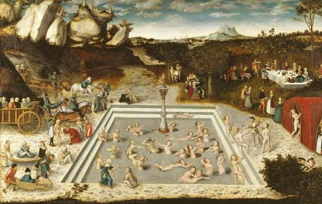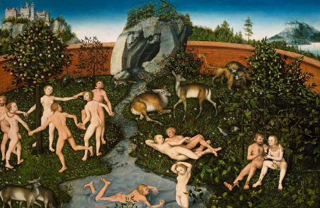 Por otro lado, una imagen menos famosa, pero más temprana y contundente, la hace Lucas Cranach el viejo en 1526 (figura 17). El pintor alemán no hace una representación de la naturaleza en el edén como un todo orgánico, libre e indeterminado, sino como una masa de seres variopintos a merced de Adán y Eva. Los animales se agrupan alrededor de los habitantes del paraíso como queriendo llamar su atención. La abundancia se hace evidente en una composición incómoda por la ausencia de vacíos. En el paraíso, nada está construido ni hay nada por construir, sino que todo está dado para su habitante regular, todo se produce por generación espontánea, no hay nada que deba esperar, no hay río que seque en verano ni cuerpo que enferme por pestes o envejezca con dolor. Recordemos las palabras de Colón en su primer viaje: