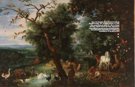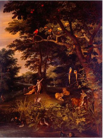 En América, esta característica se encuentra en la abundancia y perfección del clima ecuatorial que para la época se asociaba a la primavera europea en estado perpetuo. El paisaje americano serviría como referencia para el imaginario judeocristiano del paraíso. Jan Brueghel el joven, uno de los pintores del siglo XVII más interesados en el edén, rodea a Adán y a Eva de fauna y flora americana (figura 15). Brueghel privilegia, en su composición, a tres guacamayas, que, junto con un mono tití, conforman un triángulo luminoso dentro de la pintura. Por otro lado, los árboles se encuentran frutecidos y al alcance de los habitantes del paraíso. Los animales salvajes, por su parte, son representados por Brueghel (como adelantándose a la aseveración que haría Suárez [1740]) descansando al lado de Adán y Eva con pasividad. Estas características del paraíso se reafirman en otro trabajo de Brueghel el joven, a saber: El paraíso terrenal de 1626 (figura 16).