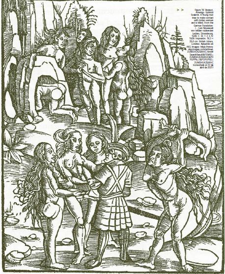 La ilustración y écfrasis de este tema se hace evidente en la Warhaftige Historia vnd beschreibung eyner Landtschafft der Wilden, Nacketen, Grimmigen Menschfresser Leuthen, in der Newenwelt America…, que escribe Hans Staden (1557) tras su secuestro en tierra americana. Estos relatos sirvieron a la legalización y legitimización de la guerra contra lo indios y plantó los cimientos de lo que se llamaría “la causa justa” sugerida en el célebre texto de Juan Gines de Sepúlveda Tratado sobre las justas causas de la guerra contra los indios, escrito en Roma alrededor de 1550.