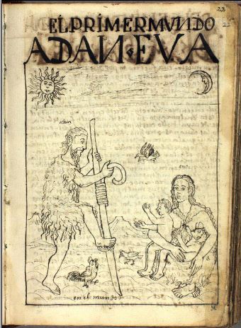 Asimismo, los colonizadores crédulos de la promesa mesiánica iniciaron pronto exploraciones etnográficas para conocer las lenguas y costumbres aborígenes que permitieron procesos de evangelización con mayor efectividad y menor violencia. Entre otros, el dominico Bartolomé de las Casas es uno de los religiosos más conocidos por denunciar los comportamientos violentos de los españoles. La idea que se hace De las Casas sobre los indios tiene más que ver con la de un niño inocente y desprotegido que con la de un salvaje impío; sin embargo, no se debe confundir la posición del dominico con la total benevolencia. La relación entre el mesianismo y América se da con menor agresividad, pero se mantiene la esperanza de adueñarse del paisaje apadrinando, guiando y fidelizando a sus habitantes. La inocencia adjudicada a los habitantes originarios y la sorprendente santidad que de esta habían deducido los franciscanos joaquinistas hizo que, en textos como Nueva crónica y buen gobierno, de Felipe Guamán Poma de Ayala (1610-1614), se representara a los indígenas con leyendas alusivas a “Adán y Eva en el Nuevo Mundo” (figura 20).