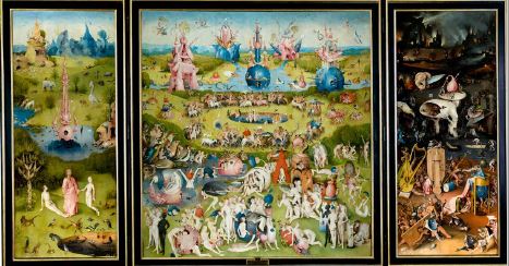 1. En el paraíso se vive la ausencia de toda moral. Antes del pecado original, se habitaba en un espacio libre de escrutinio moral, pues sus habitantes tomaban siempre decisiones acertadas. Suárez (1740) afirma: “Las ciencias naturales innatas de Adán y Eva eran tan profundas que antes del pecado no había posibilidad de equivocarse ni de ser engañados, es decir, de tomar lo falso por verdadero y viceversa, a menos de hacerlo por voluntad. Pues la ignorancia y el error constituyeron un castigo del pecado” (232). Esta condición, llevada a la visualidad y a las condiciones mundanas del bienestar, han hecho que el paraíso se represente como el lugar de la desnudez y el goce (figuras 9-10-11). El ejemplo más evidente podría ser El jardín de las delicias (1505) en que el purgatorio y el infierno son lugares de placer descontrolado y el edén es un lugar de la desnudez inocente.