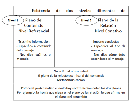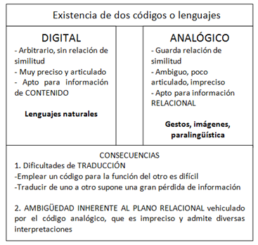 Si toda “comunicación tiene un aspecto de contenido y un aspecto relacional hay que suponer que las dos maneras de comunicación no sólo existen lado a lado, sino que se complementan entre sí en cada mensaje. Asimismo, hay que suponer que el aspecto relativo al contenido se transmite en forma digital, mientras que el aspecto relativo a la relación es de naturaleza predominantemente analógica” (Watlawick, Beavin y Jackson 1985: 65).