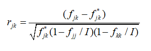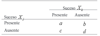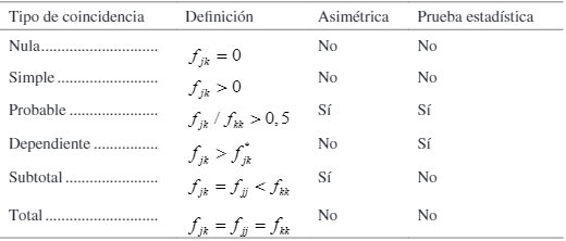 A partir de esta igualdad, dos sucesos dados tienen coincidencia dependiente siempre que su frecuencia sea mayor que la esperada (f*jk) bajo el supuesto de independencia.