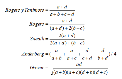 Estos coeficientes o medidas de proximidad binaria pueden clasificarse en cuatro tipos. En el primero, se incluyen las medidas similares a la de matching (también conocida como la de Rogers y Tanimoto), pues son un cociente entre un numerador en el que aparecen tanto las coincidencias positivas (los dos sucesos aparecen en el mismo escenario), como las coincidencias negativas (los dos sucesos están ausentes en el mismo escenario), y un denominador en el que se contemplan todos los escenarios, aunque con distinto peso. Otras medidas que pertenecen a esta categoría son la de Rogers, la de Sneath, la de Anderberg y la de Gower2.