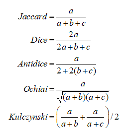 Con estas cuatro cantidades que representan las frecuencias de los cuatro estados de presencia/ausencia de dos sucesos en el conjunto de escenarios estudiados pueden obtenerse las llamadas medidas de proximidad binaria (Hubálek 1982).