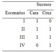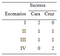 Con un sencillo ejemplo, se comprenderá mejor esta distinción. Imaginemos que tenemos cuatro escenarios en cada uno de los cuales se lanzan dos monedas y estamos interesados en los sucesos cara y cruz. Las tres posibilidades de resultados serían: a) dos caras, ninguna cruz; b) una cara con una cruz, y c) dos cruces con ninguna cara. Una matriz de ocurrencias podría presentarse del siguiente modo: