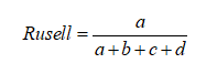 En el tercer tipo de medidas de similitud para datos binarios, solo podría catalogarse la de Rusell. Esta se caracteriza por considerar semejantes solo los escenarios en los que aparecen ambos eventos (a). De este modo, los eventos coincidentes por ausencia en los mismos escenarios son excluidos en el numerador, como ocurría en las medidas del tipo anterior. En contraste, a diferencia de las medidas similares a Jaccard, aparecen todos los escenarios posibles (a+b+c+d) en el denominador.