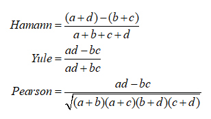 Finalmente, en el cuarto apartado pueden incluirse todas aquellas medidas en las que en el numerador se comparan (sustraen) las frecuencias de coincidencias (tanto si aparecen como si no aparecen los fenómenos) con las frecuencias de no coincidencias (escenarios en los que aparece un fenómeno, pero está ausente el otro). Como consecuencia, estas mediciones pueden ser positivas, si predominan sucesos coincidentes, o negativas, en caso contrario, es decir, cuando predominan los escenarios en los que los sucesos no coinciden. A este apartado pertenecen las conocidas medidas de Hamman y Yule, así como la de Pearson.
