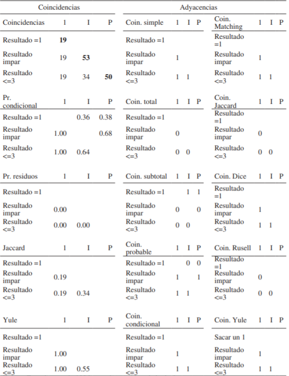 En la tabla 5 aparecen 10 matrices de adyacencias en las dos columnas de la derecha. En la de la izquierda se han expuesto algunas de las matrices de similitud de las que proceden: Desde la de coincidencias hasta la matriz de los coeficientes de Yule. Como puede observarse los resultados difieren según se emplee uno u otro criterio. Hay plenas coincidencias simples, probables y condicionales. De igual modo, mediante las medidas de matching, Dice y Yule los tres sucesos pueden considerarse coincidentes, pero no lo son, si se tienen en cuenta las medidas de Jaccard o Rusell. Sacar un 1, implica sacar un número impar o un número pequeño; pero no a la inversa. Por tanto, ambos pares de sucesos pueden ser catalogados como coincidencias subtotales.