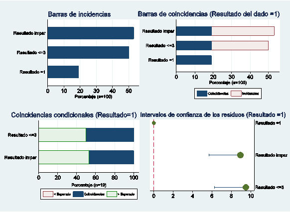 El tercer tipo de gráfico de barras es el de las coincidencias condicionales. Al igual que el anterior, se centra sobre la relación de un suceso con todos los restantes representados cada uno de ellos mediante una barra. Ahora bien, en lugar de tener en cuenta todos los escenarios, solo aparecen reflejados en el gráfico aquellos en los que ha aparecido el suceso representado. Las barras indican, como en el tipo anterior, porcentajes, pero en esta ocasión los porcentajes son condicionales, es decir, el cociente entre la frecuencia de aparición conjunta y la frecuencia del suceso en consideración. En cada barra, además de representar el porcentaje condicional de aparición del suceso de dicha barra sobre el suceso del gráfico, también se representa el porcentaje del suceso condicionado con el fin de saber si la probabilidad condicional es mayor o menor que éste. En el caso de que sea menor (aparece a la izquierda), los dos sucesos serán condicionalmente coincidentes. En el caso opuesto de que sea mayor, entonces no podrían hablarse de coincidencia. En el gráfico situado abajo a la derecha de la figura 4, con tono más oscuro están representados los porcentajes condicionales de las coincidencias (en los dos sucesos representados adoptan un valor del 100%, puesto que todos los unos son menores que tres e impares. Con tono más claro, se dibujan las frecuencias relativas de las incidencias de sacar un número impar y de sacar un resultado bajo. Como ambas están por debajo de los valores anteriores, representados con barra oscura, quiere decir que hay coincidencia condicional. Además, como ambas también alcanzan el 100%, se trata de coincidencias subtotales.
