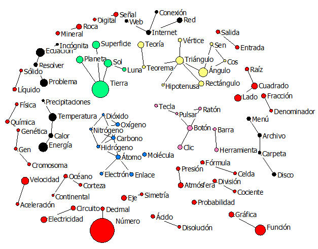 El siguiente uso del análisis reticular de coincidencias es el análisis de contenido. En un estudio para la fundación ECOTEC, Quintanilla et al. (2011) analizaron los libros de texto españoles de la ESO, a fin de descubrir la cultura científica que estos materiales trasmiten. Para ello, se escanearon 81 textos de cuatro editoriales y se realizó con la ayuda de Atlas.ti una codificación de los principales conceptos científicos. De ellos, se seleccionaron 227 para el análisis por ser que tuvieron más de 200 apariciones en los 134.397 párrafos analizados. Finalmente, para ver cómo se articulaban a través de los textos, se emplearon los residuos ajustados de Haberman (véase infra), para entresacar aquellos que aparecían con más regularidad en los mismos párrafos y, de esta manera, no solo se presentaba la frecuencia de aparición, sino también con qué otros conceptos aparecían. A tales efectos, se empleó el análisis de redes a partir de una matriz de adyacencias construida bajo la suposición de que dos conceptos están vinculados si aparecen de modo significativo en los mismos párrafos. Empleando estas técnicas se elaboraron gráficos como el presentado en la figura 1.