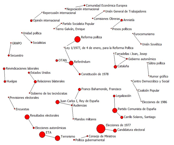 Otro uso similar de esta técnica se empleó para analizar el contenido de textos periodísticos (Escobar, 2009). En concreto, se empleó el archivo hemerográfico del Profesor Juan Linz sobre la transición española en la prensa (1973-1987), que había sido catalogado por la Biblioteca del Centro de Estudios Avanzados en Ciencias Sociales del Instituto Juan March con un extenso tesauro de 10.000 descriptores. Entre estos, 442 aparecieron en más de 200 artículos diferentes y fueron analizados con el ARC, obteniendo, entre otros, el siguiente gráfico que resume los contenidos más relevantes, así como su conexión entre ellos (figura 2).