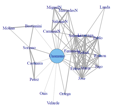 También este análisis ha sido empleado para analizar documentos fotográficos (Escobar, 2015). En concreto, se rescataron dos álbumes familiares de principios del siglo XX con el objetivo de estudiar qué personajes aparecen en las mismas fotografías: el de Miguel de Unamuno y el del músico sevillano Joaquín Turina. Para analizar el primero, se empleó el fichero de catalogación de las fotos elaborado por la Casa de Unamuno de la Universidad de Salamanca, convirtiendo el campo de los 27 personajes que aparecían en más de 2 fotografías en otras tantas 27 variables dicotómicas. Fruto del ARC, se dibujó una red en la que el centro era el filósofo bilbaíno, que aparecía junto a otros personajes en las fotografías de sus viajes etnográficos, al tiempo que también estaba fuertemente vinculado con los miembros de su familia, esposa, hijos y nietos, que a su vez estaban estrechamente conectados, especialmente sus ocho hijos con su madre. (Véase figura 3).