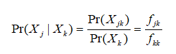 La probabilidad conjunta de dos sucesos Xj y Xk, expresada como Pr(Xjk) viene dada por la frecuencia de que ocurran en el mismo escenario divida también por el conjunto de escenarios contemplados en un determinado conjunto: