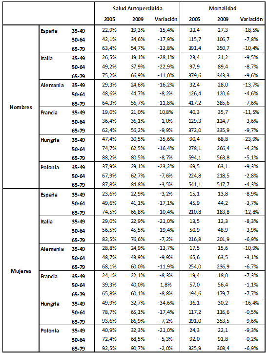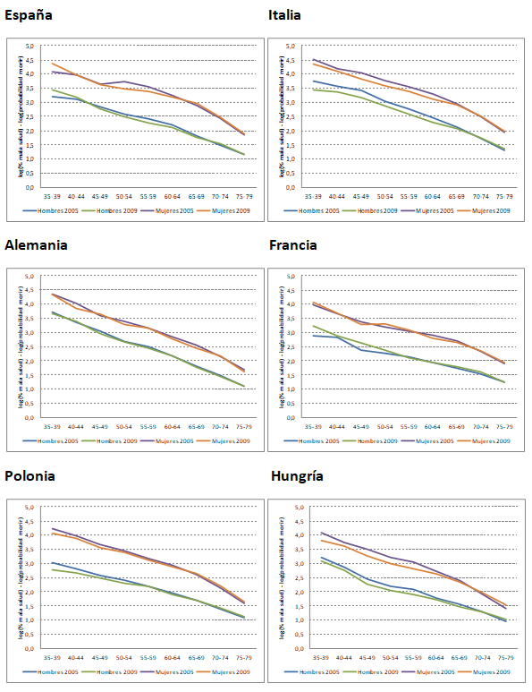 El trabajo describe a nivel poblacional la relación formal entre el indicador de la salud autopercibida y las probabilidades de morir en edades posteriores a la juventud (35-79) según grupos de edad quinquenales en seis países del ámbito europeo (Alemania, Francia, España, Italia, Polonia y Hungría), en los años 2005 y 2009. Los datos proceden de la encuesta sobre Condiciones de Vida en la Unión Europea (EU-SILC) para la salud autopercibida, y de la Human Mortality Database (HMD) para la mortalidad. Se han observado patrones claros por edad y sexo comunes en los seis países estudiados, aunque también existen diferencias claras que se comentan a continuación.