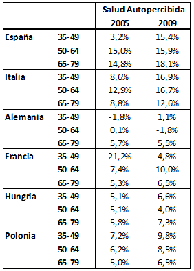 La mencionada peor salud de las mujeres respecto a los hombres presenta intensidades diferenciadas entre los países analizados. Las diferencias por sexo muestran sus menores valores en Alemania (dónde incluso las mujeres llegan a mostrar menor prevalencia de mala salud en 2005 para el grupo 35-49 y en 2009 en el grupo 50-64, aunque con valores muy pequeños, -0.5 y -0.8 puntos porcentuales respectivamente), mientras que las mayores se localizan en España e Italia (12,1 puntos porcentuales en España