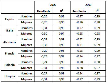 Por último, la Tabla 3 muestra los resultados parala pendiente y el coeficiente de ajuste (R2) de las rectas de tendencia lineal entre salud autopercibida y mortalidad para cada de país, año y sexo. Los valores de R2 son muy elevados, confirmando la linealidad de la relación entre mala salud y mortalidad por edad. Cabe destacar el caso de España, que aunque sin dejar de mostrar valores altos para la R2, estos son menores para las mujeres respecto al resto de países. En cuanto a las pendientes de estas rectas de ajuste, todas presentan un signo negativo, indicando un descenso en la relación entre ambos indicadores como consecuencia de un mayor aumento con la edad del logaritmo de las probabilidades de morir respecto del logaritmo de la prevalencia de mala salud autopercibida. Cuando se comparan los resultados entre los diferentes países vemos como Alemania, para ambos sexos, muestra mayores valores en ambos años, mientras que Francia los menores. En cuanto a las diferencias entre mujeres y hombres dentro de cada país, los países del sur y del centro del continente muestran diferencias nulas o muy pequeñas, mientras que en los países del este estas diferencias son mayores, siendo el descenso por edad de la relación entre ambos indicadores mayor entre las mujeres.