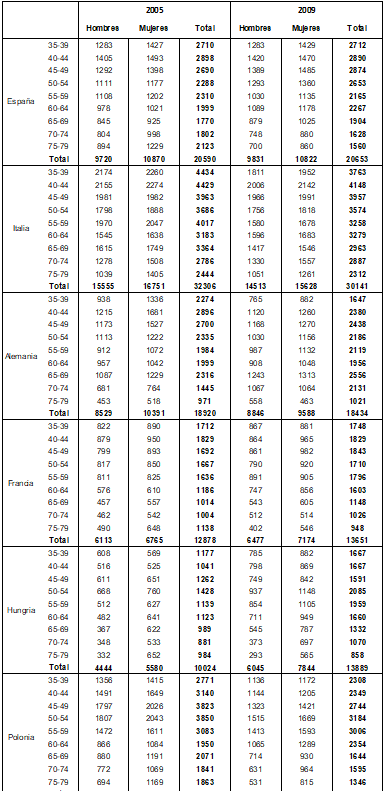 Para visualizar los resultados, los países se han agrupado según criterios geográficos: sur (España e Italia); centro (Francia y Alemania); y este (Polonia y Hungría). Esta agrupación coincide con las diferencias en los niveles de esperanza de vida al nacer de cada uno de los países. El primer grupo recoge los países con una mayor esperanza de vida (España (78,59 y 84,65 para hombres y mujeres respectivamente); Italia (79,22 y 84,24)); el segundo grupo de países presenta valores intermedios (Francia1 (77,78 y 84,44); Alemania (77,46 y 82,57)); y el tercer grupo los valores más bajos así como mayores diferencias entre mujeres y hombres (Polonia (71,48 y 79,92); y Hungría (70,21 y 78,23)).