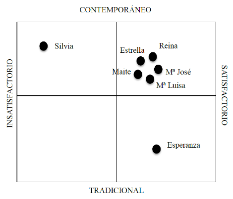 Un segundo factor sería que la estrategia seguida por sus madres haya significado una vivencia satisfactoria o insatisfactoria para las hijas en su infancia según se desprende de sus discursos. A partir de estos dos factores se podrían posicionar los casos analizados en un plano cartesiano en el que en el eje horizontal se situaría la satisfacción/insatisfacción con la estrategia seguida por las madres y en el eje vertical la contemporaneidad/tradicionalidad (desde la perspectiva actual) de la misma.