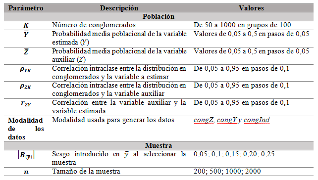 Los parámetros tenidos en cuenta para generar las poblaciones y extraer las muestras se presentan en la Tabla 1. Dado el número de condicionantes incluidos al generar las poblaciones con el diseño factorial, hubo que elegir una muestra de 500.000 poblaciones que fueron simuladas utilizando un sistema de computación en la nube de Microsoft Azure.