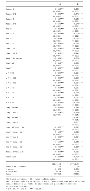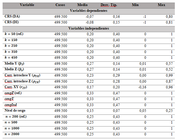 se refiere al sesgo absoluto de la estimación sin ponderar. Estas medidas de cambio en el sesgo de las estimaciones fueron modeladas por separado, la ponderación individual (DI) y la agregada (DA), con el fin de determinar el impacto de los diferentes factores incluidos en la simulación. Para ello se utilizaron modelos de regresión lineal ajustados con mínimos cuadrados ordinarios. En la Tabla 2 se presentan los estadísticos descriptivos de las variables incluidas en los modelos de regresión. Las interacciones y los términos cuadráticos fueron omitidos para facilitar la interpretación de la tabla.
