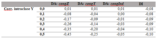 La Tabla 3 es una ampliación del gráfico a) en la que se observa con más detalle que el impacto de la agrupación de la variable a estimar varía según sea la modalidad de los datos (congZ, congY, congInd). El caso más favorable se da con el sistema congZ, en el que el nivel de agrupación de la variable estimada es determinado por su correlación con la variable auxiliar. En ese escenario el aumento del nivel de la correlación intraclase en una décima supone una reducción media del sesgo de 9 puntos porcentuales, que contrasta con la reducción en las modalidades congY (5 puntos) y congInd (1 punto). Esta diferencia se explica por las condiciones bajo las que se da la agrupación de la variable estimada. En el caso de congZ, para que se dé un nivel alto de agrupación deben concurrir dos supuestos: 1) la variable auxiliar debe presentar un nivel alto de agrupación y 2) la variable auxiliar debe estar correlacionada con la variable a estimar. En cambio, bajo el sistema congY, que la variable a estimar esté agrupada en no conlleva que la correlación con la variable auxiliar sea alta, por ello el impacto de la agrupación es menor.