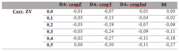 La Tabla 4 es una ampliación del gráfico b) en la que se observa el comportamiento de la reducción del sesgo según el nivel de la correlación y la modalidad de los datos. El caso más destacado se da bajo el sistema congY, en el que, por ejemplo, cuando el nivel de la correlación aumenta en una décima hasta rZY = 0,1, el CRS se reduce de -0,07 a -0,13, mientras que en el caso de los datos individuales (DI), ese mismo cambio en rZY solo implica una variación mínima del CRS (de 0,0 a -0,02).