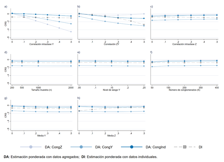 La Figura 5 presenta el efecto que tiene cada factor incluido en la simulación sobre la capacidad de la ponderación de corregir el sesgo de las estimaciones. Cada gráfico representa, en el eje horizontal, una de las características relevantes incluidas en las simulaciones, mientras que el eje vertical representa, en todos los casos, la proporción en la que varía el sesgo de las estimaciones al aplicar la ponderación (CRS). Cada gráfico, a su vez, contiene cuatro líneas, tres correspondientes a las ponderaciones hechas a partir de datos agregados (DA) y una correspondiente a la ponderación individual (DI). Las tres líneas que representan a las ponderaciones hechas a partir de datos agregados (DA) simbolizan los diferentes mecanismos utilizados para generar las poblaciones: congZ, congY y congInd.