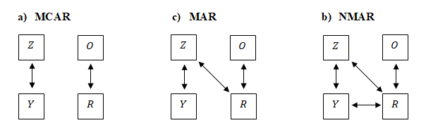 La efectividad de las ponderaciones está determinada por el mecanismo que subyace a los datos perdidos. En la literatura se diferencian tres mecanismos de datos perdidos: MCAR (missing completely at random por sus siglas en inglés), MAR (missing at random) y NMAR (not missing at random) (Bethlehem et al. 2011; Little y Rubin 1987). La Figura 1 adaptada de Bethlehem et al. (2011) presenta un resumen de cómo operan los diferentes mecanismos. Bajo el mecanismo MCAR la ponderación es innecesaria ya que la estimación no está sesgada, y bajo el mecanismo NMAR es fútil ya que la participación en la encuesta depende directamente de la variable a estimar. Solo en el caso de MAR se dan las condiciones para que la ponderación, basada en las variables auxiliares (Z), corrija el sesgo en la variable a estimar (Y).