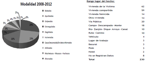 El informe presenta desagregados los datos por modalidad y por lugar del hecho que multiplican los valores que puede asumir un indicador. Por ejemplo, en el caso de modalidad, se contempla: “baleadas”, “apuñaladas”, “golpeadas”, “estranguladas”, “incineradas”, “[por] causa desconocida/sin datos informados”, “[por] Machetazos-mazazos-hachazos”, entre otras. La prolífera clasificación de las modalidades, sin embargo, no se somete a análisis alguno a lo largo del informe, a excepción del que refiere a las asesinadas a efecto del uso del fuego que tiene dedicado un capítulo entero sobre el que volveremos más adelante.