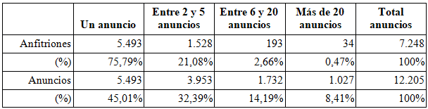 La presencia de anfitriones comerciales con múltiples anuncios en Airbnb es uno de los principales focos de conflicto en torno a la actividad de la plataforma, lo que ha sido señalado en múltiples investigaciones (Gil, 2018; Wegmann & Jiao, 2017; Red2Red Consultores, 2017; CBRE Hotels’ Americas Research, 2017; Merante y Horn, 2016; Lee, 2016; Marqusee, 2015). En dichas investigaciones se diferencia entre anfitriones con un único anuncio (modelo p2p) y anfitriones con múltiples anuncios (modelo comercial). Pero dicho análisis es insuficiente para conocer en profundidad la realidad y efectos de Airbnb en una ciudad. Esto se debe a que se dan casos de anfitriones con un único anuncio, que alquilan los 365 días del año, y que por lo tanto responden al modelo comercial y no cumplen los principios de la economía colaborativa.
