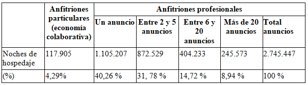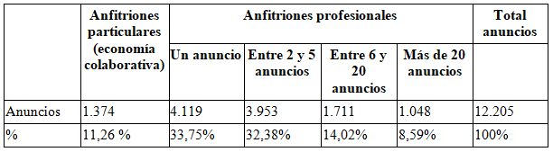 De esta manera, se observa que en Madrid tan solo el 11,26% de los anuncios en Airbnb corresponden a formas de hospedaje entre particulares. Por el contrario, el 88,74% de los anuncios en la ciudad lo controlan anfitriones profesionales e inversores. Desde esta perspectiva, se puede afirmar que la actividad de Airbnb en Madrid no se articula sobre formas de hospedaje del campo de las economías colaborativas, sino sobre actores especializados que controlan el sector (inmobiliarias, empresas especializadas y grandes y medianos propietarios).