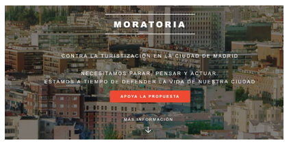 De forma paralela a esta paulatina incorporación de otros colectivos a la lucha contra la turistificación, el colectivo Lavapiés ¿dónde vas? lanzaba la propuesta “Moratoria turística en el centro de Madrid”12 en la plataforma Decide Madrid13, plataforma de participación ciudadana desarrollada por el Ayuntamiento de Madrid en la que se pueden realizar “Propuestas Ciudadanas” que de ser votadas por el 1% del censo, debe ser sometida a consulta ciudadana (referéndum).