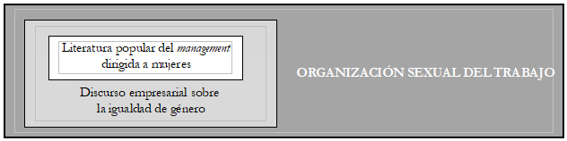 En nuestra investigación optamos por realizar un análisis del discurso de una muestra de la literatura popular del management dirigida a mujeres, que se centre en la identificación y estudio de aquellos componentes que nos permitan identificar los valores sobre los que se construye el modelo de mujer líder dentro de dicha literatura. Así, más allá de poner el foco de atención en el aspecto estructural, nos centraremos en el discernimiento de los discursos y la ideología impresos en las obras. Debemos tener en cuenta que el discurso dentro de la organización está monopolizado por la dirección y este privilegio es considerado por el resto de grupos como algo natural y neutral en lo que respecta a valores (Alvesson y Willmott 1992: 24). Sin embargo, en la medida en que la dirección ha sido tradicionalmente asociada a lo masculino, dichos valores masculinizados y en muchas ocasiones excluyentes (Benschop y Doorewaard 1998; Due Billing 2011; Kenny y Fotaki 2015), habrán calado en el imaginario de la clase directiva perpetuando una cultura patriarcal. Por esta razón, nos interesa desvelar los valores que hay tras la pretendida neutralidad de dicho discurso, y cómo influyen en un tema tan importante como la desigualdad de género en la empresa. Como se puede observar en la figura, los textos se inscriben dentro de prácticas discursivas, que a su vez se encuentran en el seno de las prácticas sociales (Fairclough 1992a, 1992b, 2003). De este modo, las obras del management están dentro del discurso empresarial, que a su vez está emplazado en el discurso sobre la organización del trabajo (Fernández Rodríguez 2007a, 2007b). Dichas obras son la codificación en textos del discurso sobre la organización del trabajo que tiene la empresa y que vertebra a su vez el espacio social. Si incorporamos la perspectiva de género a dicha cuestión, veremos que la literatura popular del management dirigida a mujeres se sitúa dentro del discurso empresarial sobre las mujeres líderes, y a su vez, dentro del discurso empresarial sobre la igualdad de género.