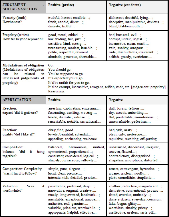 Así pues, cabe retomar aquí la categoría de la actitud que explicábamos en párrafos anteriores, y dentro de la cuál Martin (2005) identifica tres subsistemas de la posición actitudinal del hablante: afecto, que se refiere a los recursos lingüísticos utilizados para construir las respuestas emocionales; el juicio, los recursos lingüísticos empleados para construir las evaluaciones morales o sociales sobre el comportamiento, y la apreciación, los recursos lingüísticos usados para construir las cualidades estéticas de los procesos. A continuación podemos consultar algunos ejemplos tomados de Morrish y Sauntson (2013: 65) para ilustrar los recursos a los que nos estamos refiriendo: