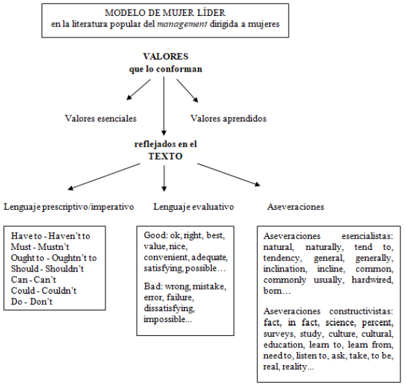Por esta razón, el enunciado imperativo o prescriptivo no tiene función primaria informativa; es decir, no es ni verdadero ni falso, pues no se refiere a un hecho dado, sino que busca guiar el comportamiento del receptor en una situación determinada. En resumen, en este tipo de lenguaje podemos encontrar los valores que pretendemos identificar, ya que a través de él se tiende a cambiar la situación existente, motiva o provoca la realización de una conducta en un cierto sentido. Esto es lo que ocurre con las obras de la literatura popular del management dirigidas a mujeres, ya que buscan transformar la situación de la mujer en la empresa, aportándole consejos y guías.