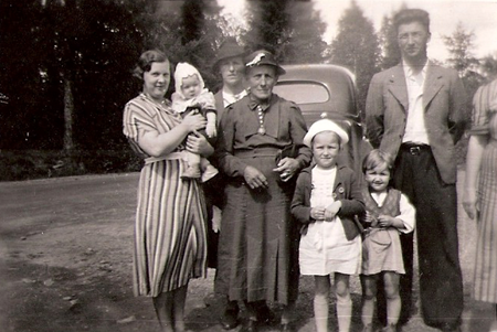 Before the digital age, when taking a photograph was a less mundane activity, people used to arrange photos in albums. A typical photo that can be found in most family photo albums is the three-generation photo, taken at some festive family occasion such as the excursion to the beach on vacation, the celebration of someone’s birthday, or the Christmas party, the graduation party, or at similar events. We typically find a group of people lined up before the camera, often spontaneously caught in the moment, or sometimes more professionally arranged, for example for weddings and other major life events (Bourdieu & Bourdieu 1965/2004). Figure 1 displays such a picture from my own family album, taken during the summer of 1939 when my mother – the six years old girl in the white cap – made a visit to the birthplace of her parents during the summer vacation, visiting the relatives that were still living in this remote village in the north of Sweden. Her father – my grandfather – stands to the right of my mother, while her mother – my grandmother – can be seen in the background to the left, just behind her mother – my great grandmother. We can see from the composition of the photo that it is taken by an amateur: the woman to the right is partly outside of the frame (while we see large parts of a gravel road and woods to the left), and, because the photographer does not want to have the camera facing the sun, it results in all persons in the picture gazing towards the sun.