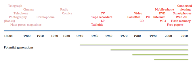 In Figure 2 has been marked out the approximate time of arrival for the most common media technologies. The only mass mediumthat was already present at the turn of the Century 1900 – the book – is bracketed, and we can then see how continuously new technologies appear, and add to those already present. Accordingly, the media landscape gets denser over time, to the point where social life as such is embeddedin media, making life a veritable media life (Deuze 2012). As individuals travel through the media landscapes, they also accumulate experience of it, adding to their experience of other societal events that occur. When individuals, or indeed social formations, move through the media landscape, this movement produces time in the same sense as Henri Lefebvre (1974/1991) has theorised time as movement in space. When individuals travel through the technological and symbolic landscape of the media, their movements on the one hand produces linear time (as in the timeline in figure 2), but also punctual time, that is, the time that is defined by its quality rather than where it can be located on a time axis. In this meaning, time receives its specific quality from the life histories, and the encounters between an individual, or a generation as a social formation, and a media landscape.