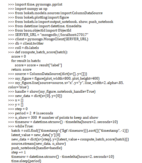 On the other hand, scholars can use different Pyhton libraries such as Matplotlib or Bokeh, to visualize the ongoing sentiments. In particular, Bokeh is a powerful tool to visualize the trends if we have stored the results in MongoDB. All scripts will visualize batches of tweets, but scholars can control parameters such as the update frequency (time to wait to poll the database for the next batch) or the number of points that can be simultaneously shown on the screen (to produce averages of minutes, hours, days, months, etc.). Control of parameters and flexible visualization of large-scale sentiments on Twitter can enhance social research designs especially when scholars need to monitor big amounts of tweets as fast as they are produced. Figure 3 shows a visualization of distributed sentiment analysis of tweets containing the hashtag “#Trump” in real time, and the next code show scholars how to execute this task with Bokeh reading from MongoDB: