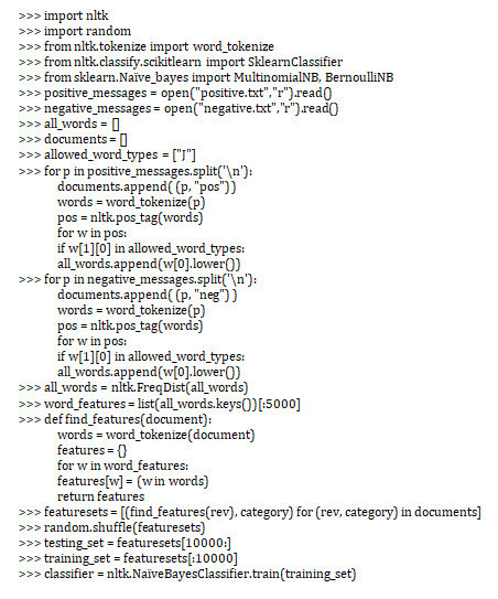 SSA involves training a model with texts examples in order to summarize their syntactic structures using their words or sentences as features. Scholars that are familiar with Python can easily train a Naïve Bayes classifier for positive/negative previous labeled messages (training set) taking only adjectives as features for the models in few lines adapted from Kinsley (2017):