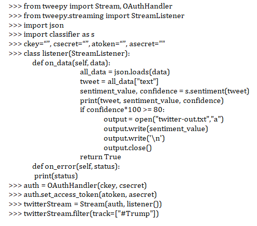 In Python, communication and audience scholars can implement the library Tweepy and use few lines of code adapted from Kinsley (2017) to connect to the Twitter Stream and run SSA in real time to monitor sentiments through messages containing a specific hashtag (i.e. #Trump) with a specific level of confidence: