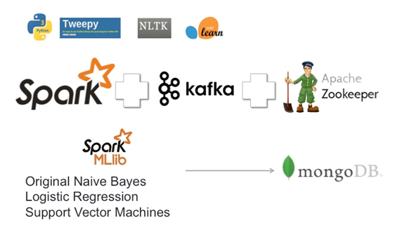 Bringing together large-scale supervised sentiment analysis and streaming analytics is a powerful approach to face big data challenges in communication research because it allows scholars to content analyze sentiments based on context with no restrictions of space (number of messages) and time (real-time and long periods with no interruption). In this section, we explain in detail how to overtake local computing limitations and use this computational method to face big data challenges using open source software with the data available from the Application Program Interface (API) of Twitter that nowadays provides freely access to an important amount of semi-structured social data (Makice, 2009). We show how scholars can: (i) train machine learning models with parallelized algorithms using previously labeled tweets; (ii) connect to the streaming of Twitter and filter relevant messages; (iii) predict sentiments in real-time in a distributed context; and (iv) store the results in a flexible database and visualize the outcomes. This method requires a set of tools such as Python 3.5, Apache Spark 2.1, Apache Kafka 2.11, Apache Zookeeper 3.4.10 and MongoDB 3.4, and can be used in a local computer but is already prepared to scale up in the cloud in any academic or commercial service (such Amazon Web Services, AWS). A summary of the algorithms and tools to run supervised sentiment analysis in real time over big amount of tweets is shown in figure 1.