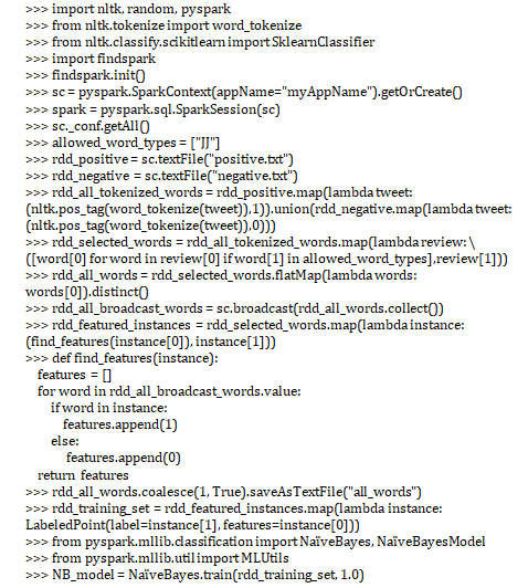 NLP includes extracting informative words based on a tag-of-speech approach, so researchers can decide which kind of word (verbs, adjectives, adverbs, etc.) will train the models. Once these words are selected, they must be grouped into an array, resulting in a sequence of words of the selected type, for example, if adjectives are selected, each tweet will be converted into an array of the adjectives of the tweet. This approach is more complex than the usual positive-or-negative word classification, as it considers sequences of words, which is useful, for example to identify degrees of positiveness and negativeness and more complex constructions such as the irony, that is impossible to identify with just the classification of words in negative or positive, as it usually has for example positive adjectives but in a specific sequence which really signifies a negative comment. This technique allows to not only considering the word but also the other ones that appears in the same tweet. The disadvantage is that much bigger training dataset is required. Going more into the detail of what is happening in the inside of the algorithm, every unique adjective present in every tweet must be registered in a dictionary of words. With this dictionary of unique words, each tweet can be transformed into an instance, an array of 1s and 0s, 1 when the word is present on the tweet and 0 otherwise. The result is a disperse array (an array with large amount of 0s and few 1s), and with as many independent variables as words in the dictionary. The next code shows how communication scholars can parallelize in Apache Spark the model training stage with the Naïve Bayes algorithm: