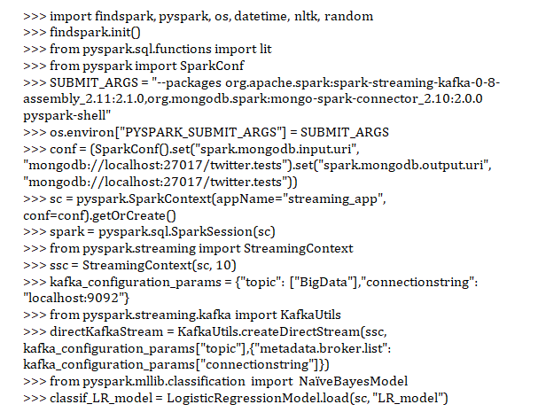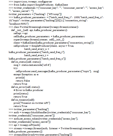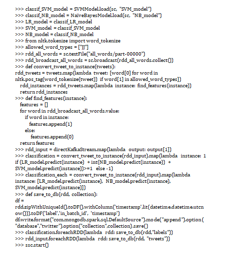 Secondly, the Twitter API STREAMING allows instant access to 1% of the whole stream. This percentage might seem a small and an insignificant amount of tweets, but the true is that when we filter the tweets (i.e. only containing a specific hashtag, such as #Trump or #ClimateChange) we will not exceed this 1% limit in most of the cases. To locally connect to the stream, scholars can obtain the necessary code access (API key, API secret, Access toke and Access token secret) by registering to the Twitter API and use the library Tweepy for Pyhton (Roesslein, 2009) that simplifies the connection and works fine in a local computer. If communication and audience researchers are dealing with a huge amount of messages for a long period of time and decide to implement large-scale and real-time collection, this library still works but needs to be implemented in a remote machine in order to continuously produce the messages that will be analyzed afterwards. This process requires the execution of Apache Kafka (together with Zookeeper), so the researcher can remotely connect to the Twitter API and send the stream to a kafka producer in order to make data available from a kafka broker. This means that large-scale supervised sentiment analysis in real-time needs a virtual computer with Apache Kafka dedicated to be connected to the Twitter stream in order to continuously produce a new flux of parsed and filtered messages that can later be accessed from different nodes to execute the tone evaluation. In this stage, communication and audience researchers can monitor or even save the parsed tweets, which are a potential advantage if they decide to run any kind of exploratory, qualitative or on-the-way analysis for quick interventions. This code summarizes the distributed implementation of this producer in Spark for real-time tweets about #Trump: