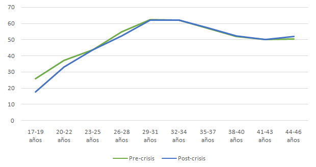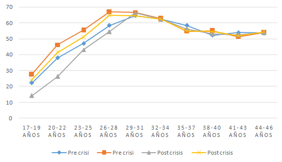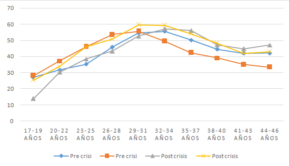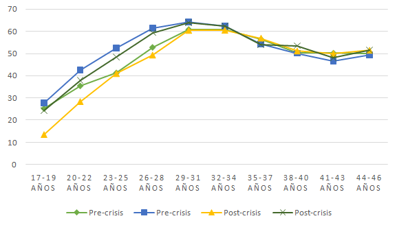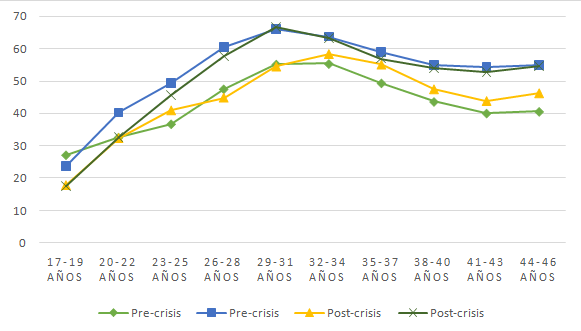 En el gráfico 2 se presenta el índice de entropía para los dos periodos de referencia y por sexo. La primera lectura que es posible realizar sobre las secuencias que describe la representación gráfica es la diferencia por sexo en todas las cohortes menos en la de menor edad, 17-19 años, para la cual las diferencias que se observan son por coyuntura económica y no por sexo; tanto varones como mujeres tendrían un porcentaje de entropía de en torno al 25 % en el periodo previo a la crisis económica y del 17,5 % en el periodo que se ha considerado como el de la salida de la crisis económica. A partir de los 20-22 años, los varones no presentan diferencias entre los dos periodos y el ápice de entropía se sitúa en ambos periodos en el intervalo de 32-34 años con un 55 % de entropía en precrisis y un 58 % en postcrisis. Para las mujeres, las diferencias por coyuntura económica se extienden hasta los 23-25 años y el ápice de entropía se sitúa a los 29-31 años, con un porcentaje de entropía del 66 % para ambos periodos. Lo más relevante del análisis de estos datos está en las diferencias por sexo más que por coyuntura económica, con diferencias por encima de 10 puntos porcentuales más en mujeres que en varones, con la excepción de las cohortes más jóvenes. La diferencia en el ápice de entropía sería de una cohorte antes en las mujeres que en los varones. En resumen, en las mujeres se produce una mayor complejidad en la distribución de estatus en toda la transición hacia la adultez y esta se completaría tres años antes que en los varones, no observándose diferencias por coyuntura económica, salvo en las cohortes de menor edad y en todo caso disminuyendo ligeramente la entropía en postcrisis.