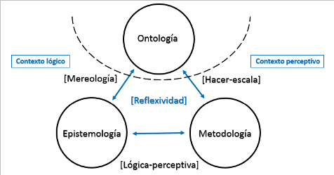 Las ideas desarrolladas hasta el momento señalan que la metodología y la epistemología se encuentran entretejidas con la ontología del objeto de estudio. Estos argumentos pueden ser tomados erróneamente como remanentes de un constructivismo radical. Pero de hecho parten de la consideración de que la existencia del objeto de estudio es independiente del investigador, por ello en la segunda gráfica la ontología aparece rodeada por una línea punteada que la separa de los otros dos momentos. Aun si, el punto a resaltar es que la capacidad de expresión de este objeto y la posibilidad de acceder a él siempre se encuentra mediada, es decir, limitada e incentivada, por la mereología y la escala, la primera entendida como el contexto lógico y la segunda como el contexto perceptivo. En consecuencia, la epistemología y la metodología no solo conceptualizan-y-recolectan información, sino que también co-producen los datos.