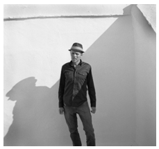 Maurice [I254]ha sido fotografiado ante dos sobrias paredesencaladas, parado en medio de ellas y como si lo rodearan, lo recogieran o lo protegieran, no en balde él vive ahora en la Granada de casitas blancas donde se encuentra feliz, como él mismo declara9. Sobre la mitad de esa pared -signo probable de lo que dice el protagonista en su carta, que “llevo viviendo aquí la mitad de mi vida”- se extiende, por ella misma y por su cuerpo, una suave penumbra, en diagonal, de la que emerge -como en el cine expresionista- una inquietante sombra que, en contraste con la estática figura real, parece caminar y que, significativamente, se dispone en una dirección contraria. De este modo, el fotógrafo traslada al lenguaje visual la desazón de Maurice en estos momentos existenciales10. No extrañe que tenga los ojos medio cegados por la luz del sol, aunque porta sombrero, y que su cuerpo esté ligeramente arqueado, como escudriñando el sol y al mismo tiempo sumiéndose en la semisombra, dudando entre buscar la luz o la oscuridad, moverse o quedarse quieto, ir al lugar del que procede o permanecer en el que ahora vive.