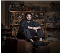 Juan [I179] está en una habitación donde aparecen, en estanterías, múltiples objetos entre los que destacan una serie de muñecos, tal vez confeccionados por él mismo, indicadores de su profesión. Está sentado, va vestido de negro con ropa cómoda, sencilla y austera y tiene los pantalones y las mangas arremangados; sus pies están encima de una maleta y otra, más grande, se encuentra a su lado. Su rostro, iluminado, deja ver unos ojos oscuros y serios y unos labios apretados, sin rabia, que anuncian una sonrisa. Ciertamente, está sentado, tiene trabajo, pero las maletas dispuestas para emprender un nuevo recorrido nos señalan que él es un “viajero”, que él es lo que es y que viene de dónde viene. En efecto, en este preciso instante nada parece indicar que se halle en la Bretaña de su destino o en la Argentina de su origen, sino en un espacio-hogar de ficciones y sueños que denota lo que siempre ha sido: titiritero, contador de cuentos.